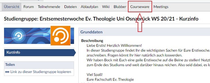 4. Gib in die Suchleiste „Erstsemesterwoche Ev. Theologie Uni Osnabrück WS 20/21“ ein.